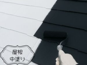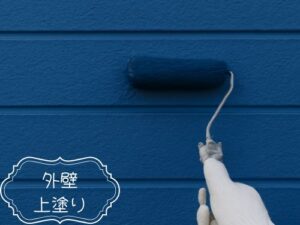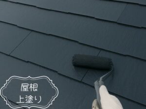 ↑中塗りでは、今回F様が選ばれたメインカラー(落ち着きのある濃いブルー系)をローラーで丁寧に塗り込んでいきます。